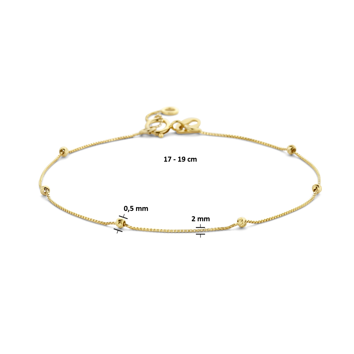 14k Geelgouden armband met een venetiaanse schakel van 0.5mm en bolletjes van 2mm. De armband heeft draaglengtes van 17cm en 19cm.