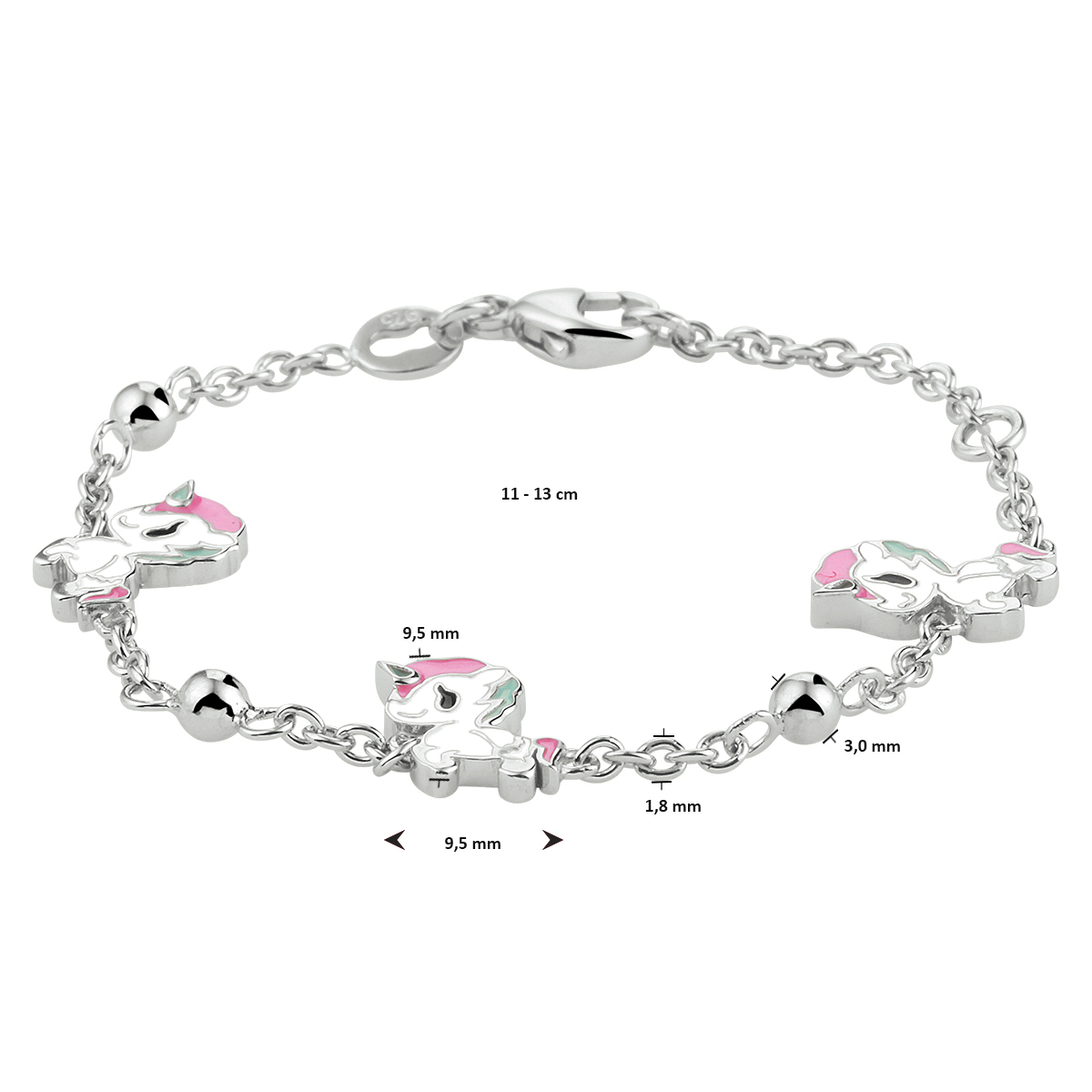 Armband zilver | geemailleerde en gekleurde unichorns | 11-13 cm