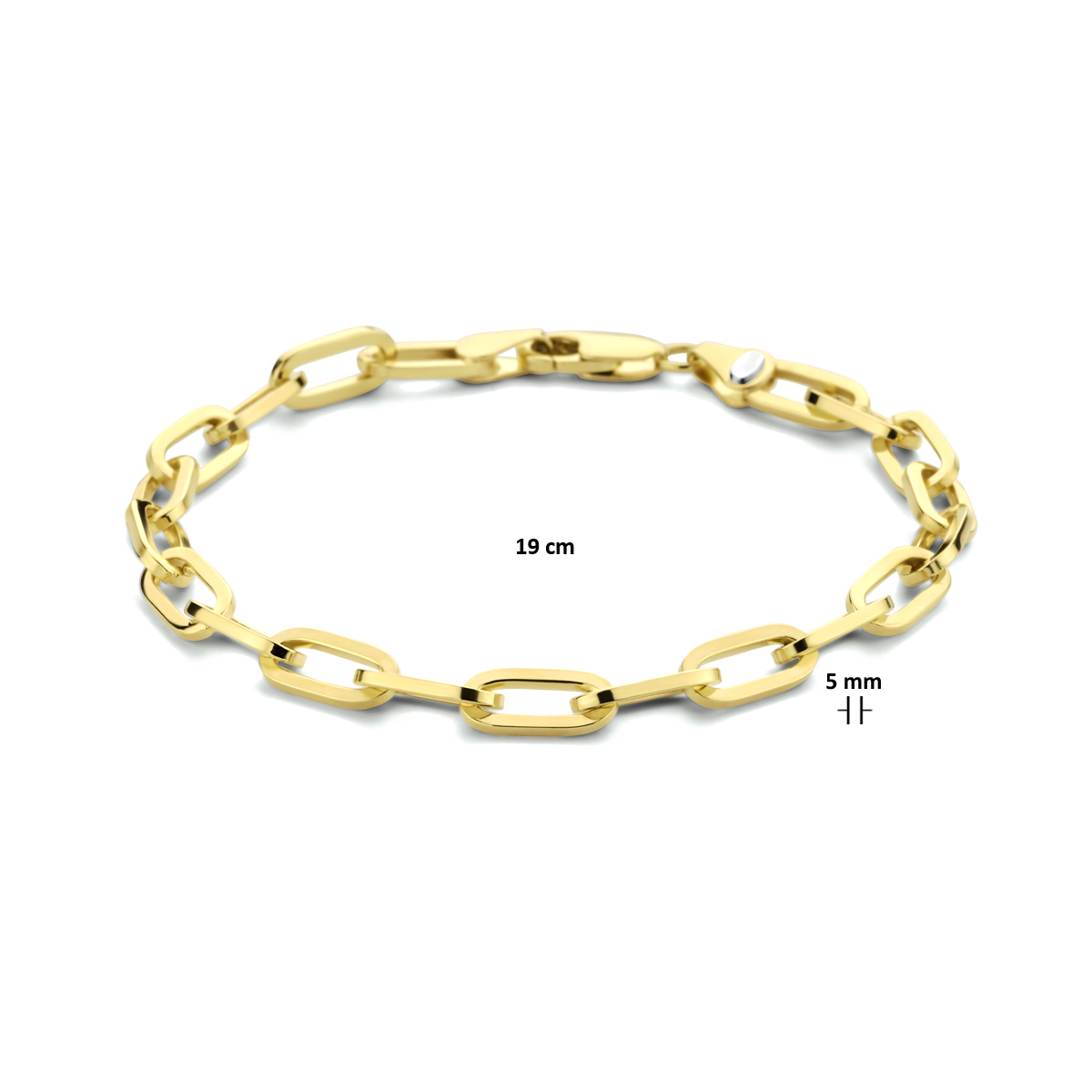14k Geelgouden armband met daarin een kern van 925 zilver. De armband is uitgevoerd met een paperclip schakel met een breedte van 5mm. De armband heeft een draaglengte van 19cm en een stevige karabijn sluiting.