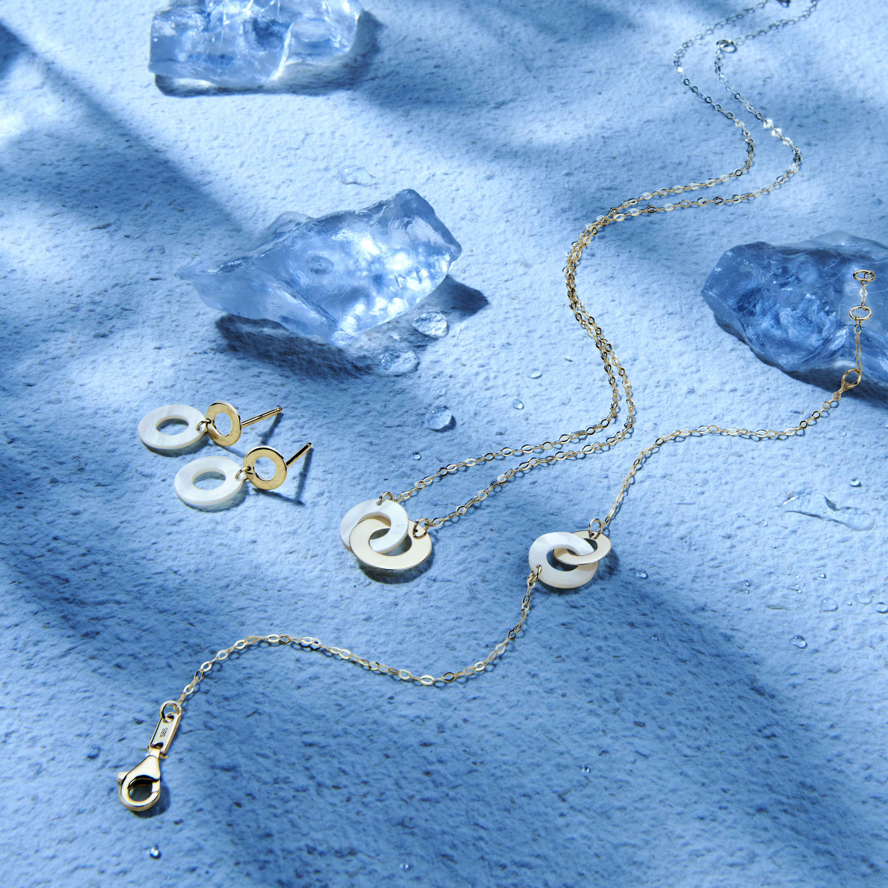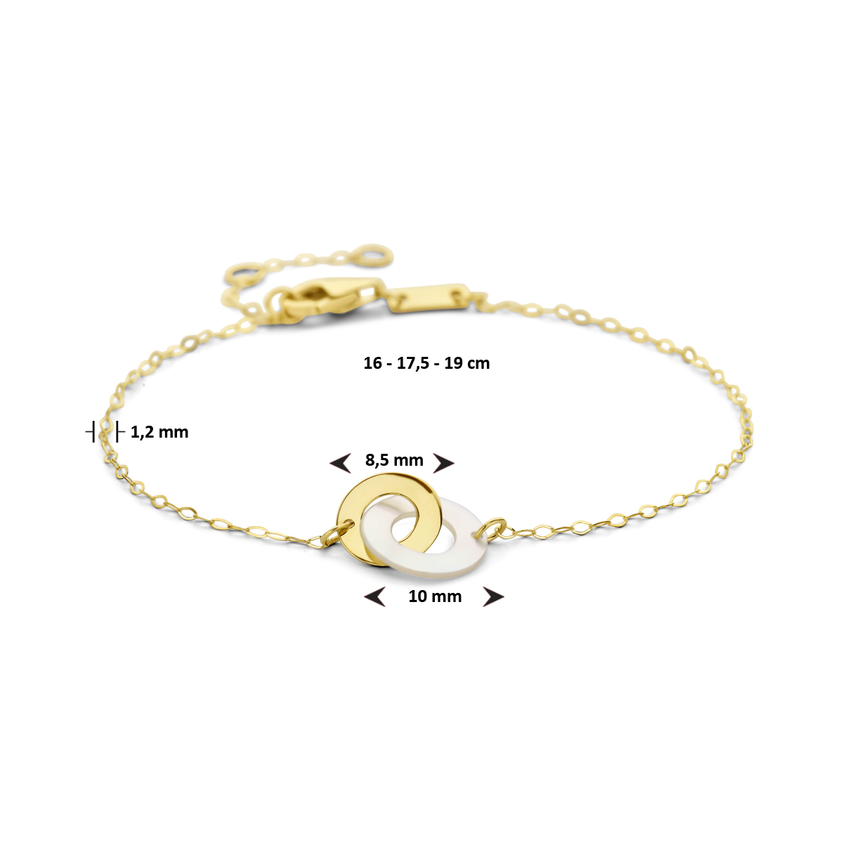 14k Geelgouden armband uitgevoerd met rondjes en parelmoer. De armband heeft draaglengtes van 16 - 17.5 en 19cm. Uitgevoerd met een karabijn sluiting. De armband heeft een schakelbreedte van 1.2mm.
