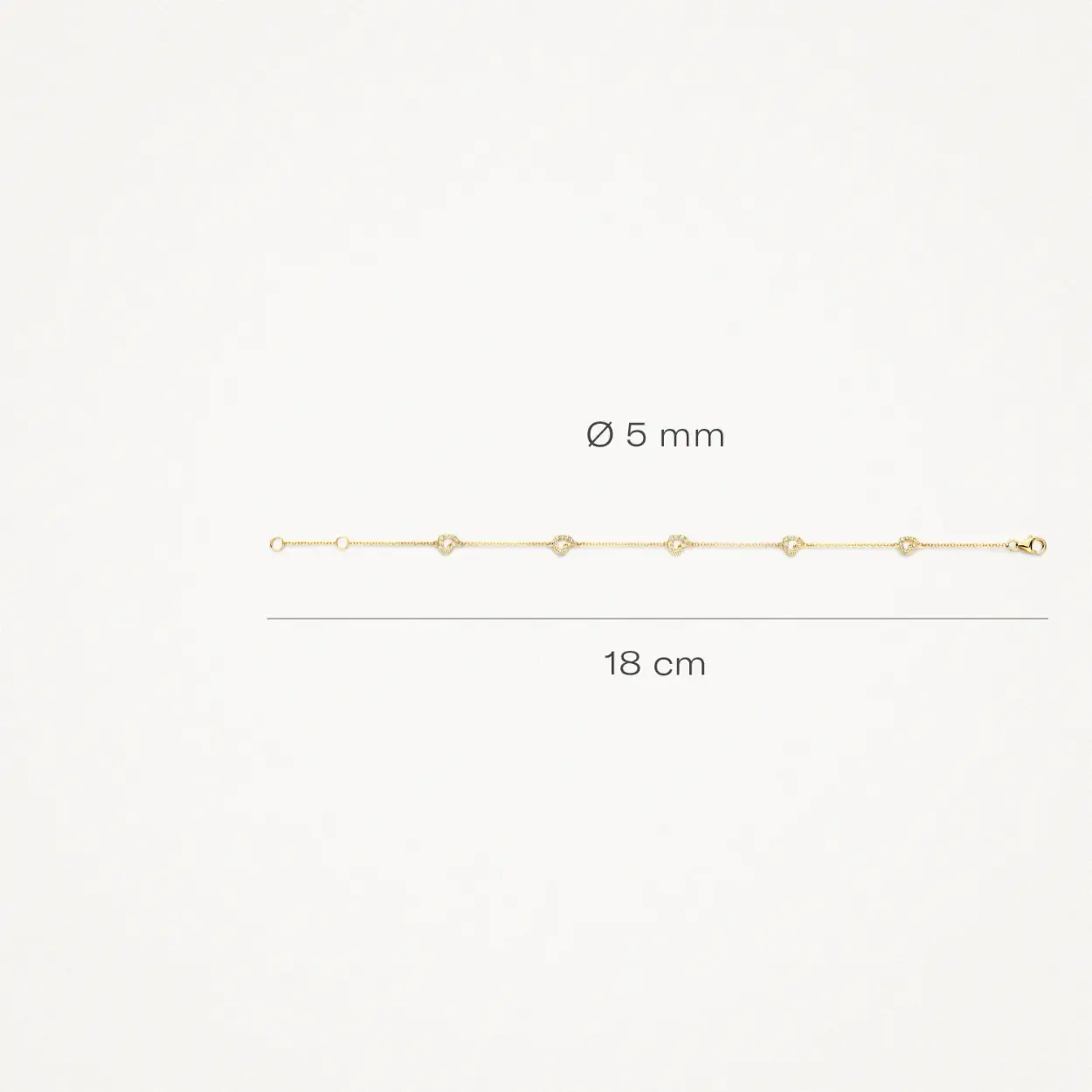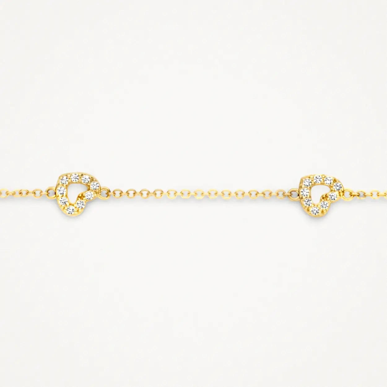Deze 14k geelgouden armband met roloschakels wordt gesierd door vijf met zirkonia bezette hartjes. De totale lengte is 18 cm en de armband heeft een karabijnsluiting. Een prachtig sieraad waarmee je je liefde kunt tonen, aan een ander of jezelf.