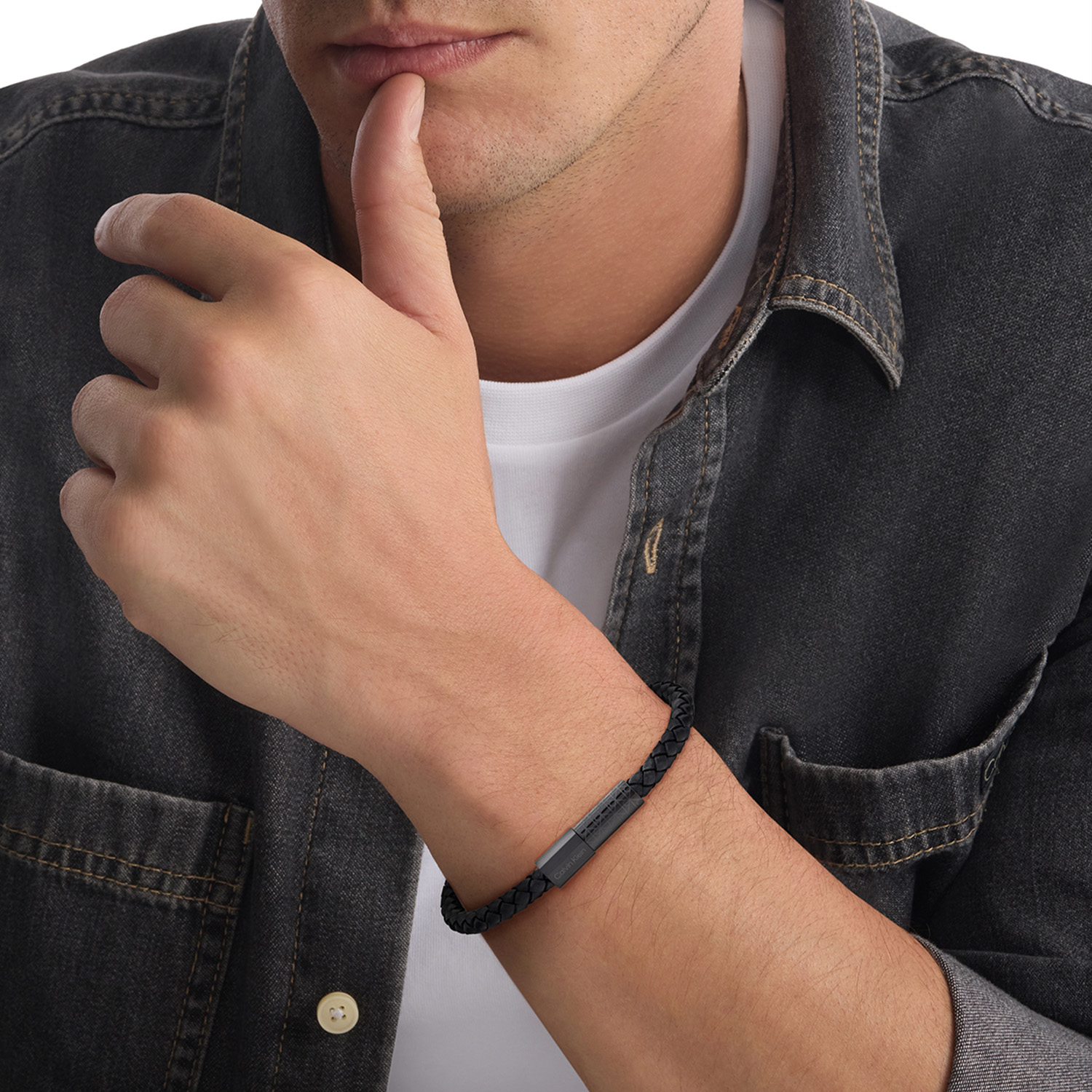Deze leren heren armband van Calvin Klein met nr CJ35100088 heeft een stoer uiterlijk. De zwarte gevlochten leren armband sluit met een verstelbaar gegraveerd en zwart magneetslot. Zowel op 18,5 of op 19,5cm te dragen. Leuk te combineren met andere sieraden uit de serie van Calvin Klein.