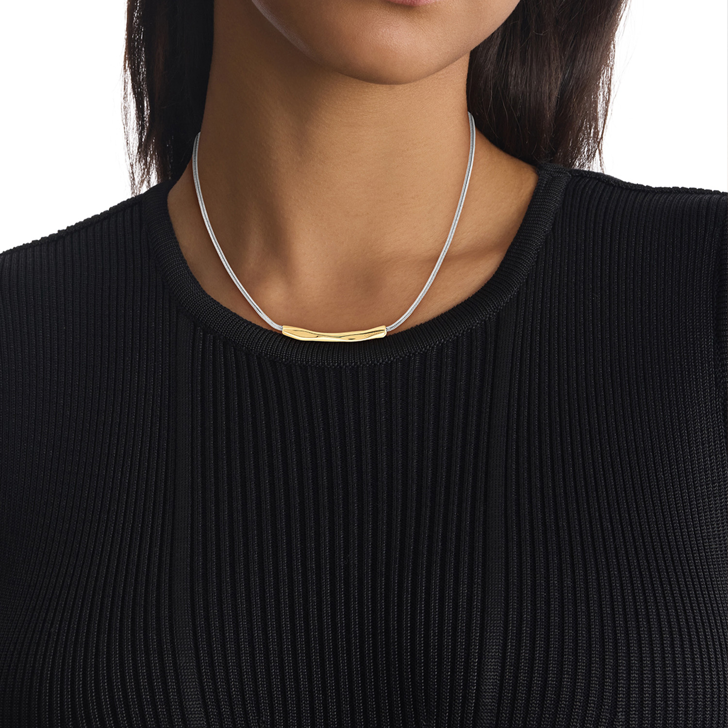 Deze stalen dames ketting van Calvin Klein heeft een apart uiterlijk. De schakelketting heeft een opvallend goudkleurig recht tussenstuk in de vorm van golven. Door extra tussenogen is de ketting op verschillende lengtes te dragen, totale lengte is 46cm. Leuk te combineren met andere sieraden uit de serie van Calvin Klein.
