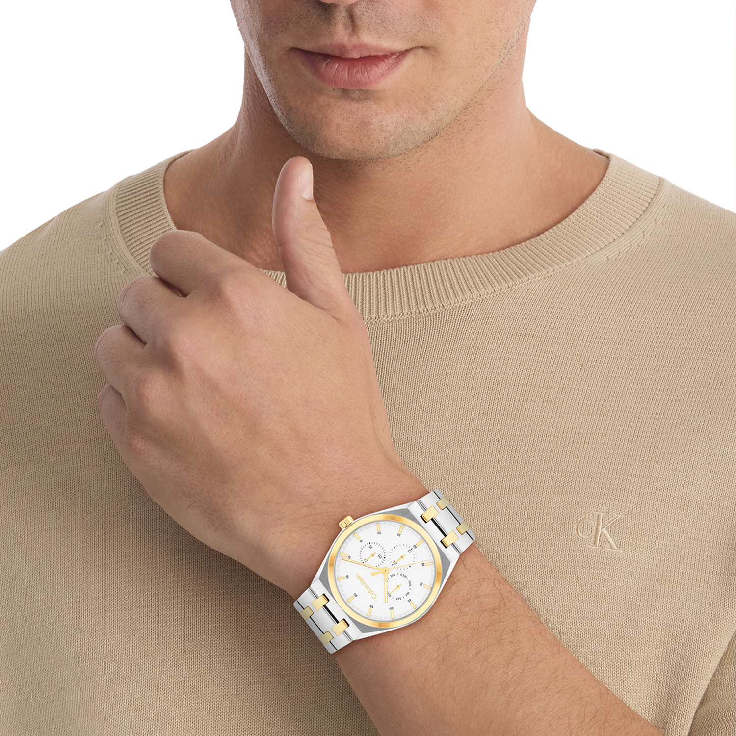 Dit Calvin Klein horloge met nr CK25200533 heeft een sportief uiterlijk. Het stalen bicolor horloge heeft een ronde kast met een gladde goudkleurige bezel en een bewerkte witte wijzerplaat met een dag, datum en 24-uursaanduiding. De fijne wijzers en de uurstrepen zijn ingelegd met lumibrite. Strak aan de kast zit een mat/ glanzende stalen bicolor schakelband met een vouwsluiting. Het herenhorloge heeft een mineraalglas, een doorsnee van 39mm en is 3ATM.