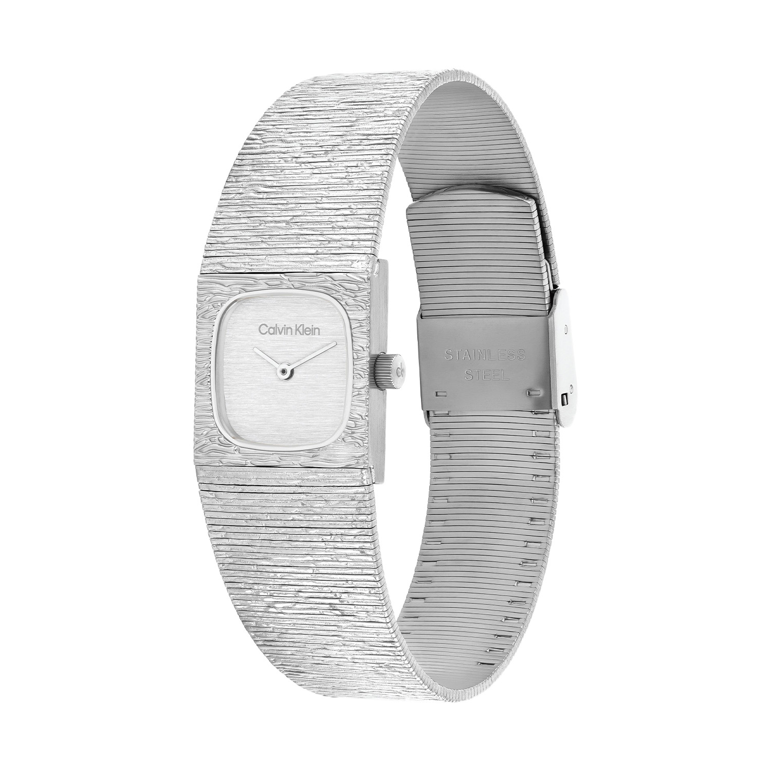 Dit Calvin Klein dameshorloge heeft een chique uiterlijk. Het stalen horloge heeft een rechte kast van 20 mm met een speciale print die ook doorloopt op de mesh band en op de zilverkleurige wijzerplaat. De fijne wijzers en de merknaam geven het een stijlvolle look. Het horloge heeft een mineraalglas, een doorsnee van 20mm en is 3ATM.