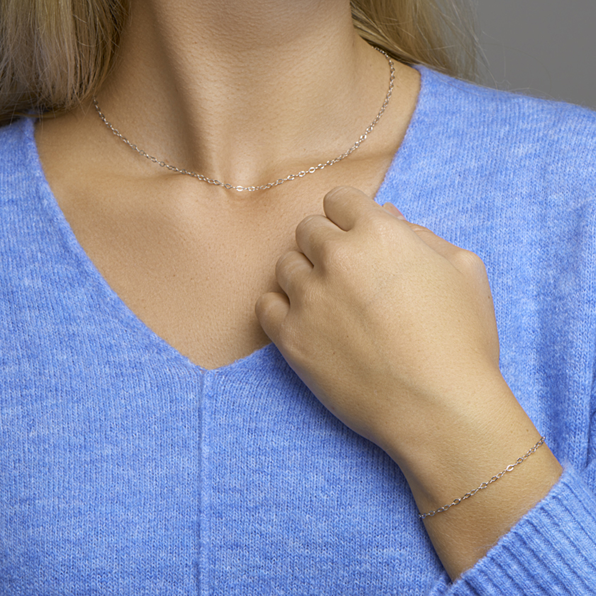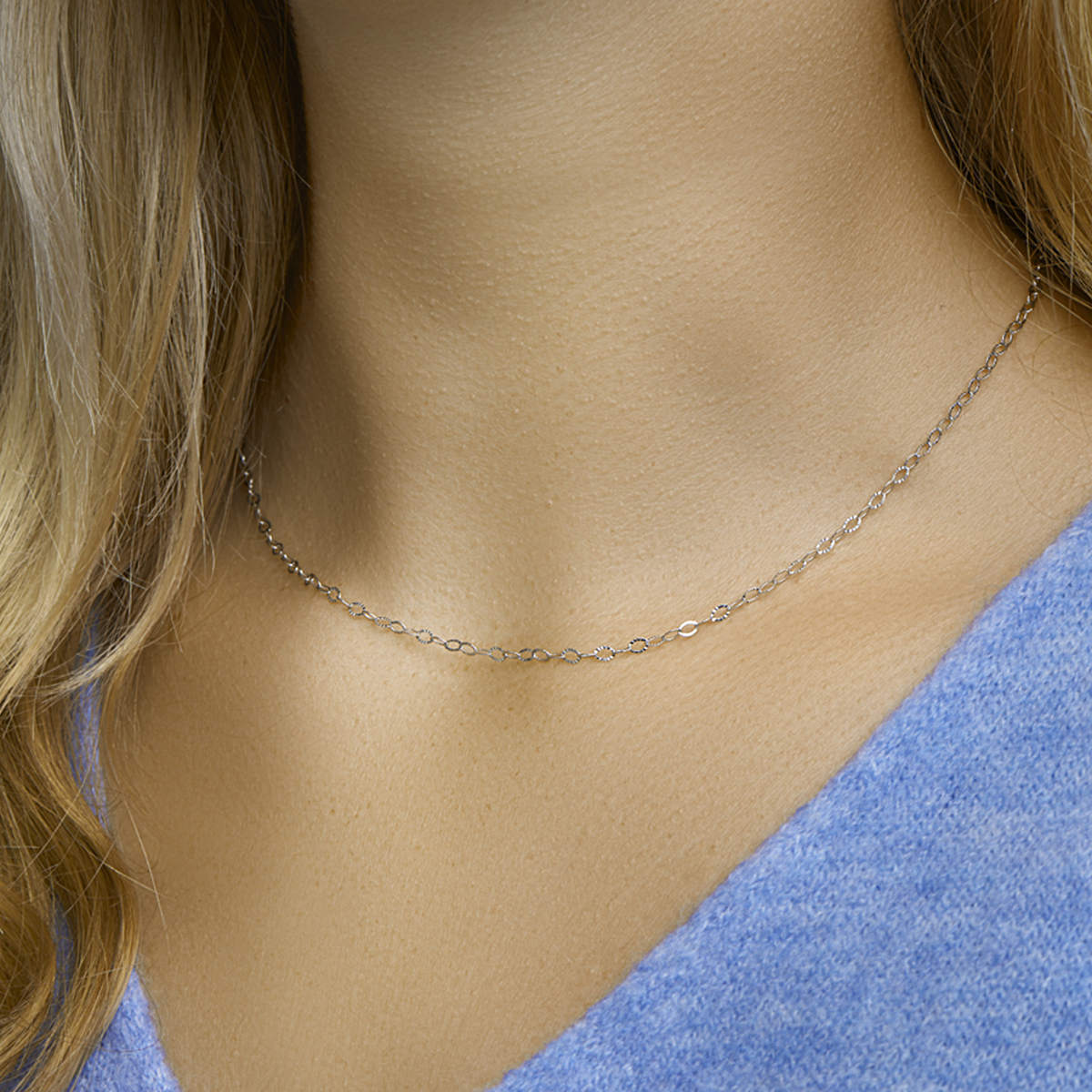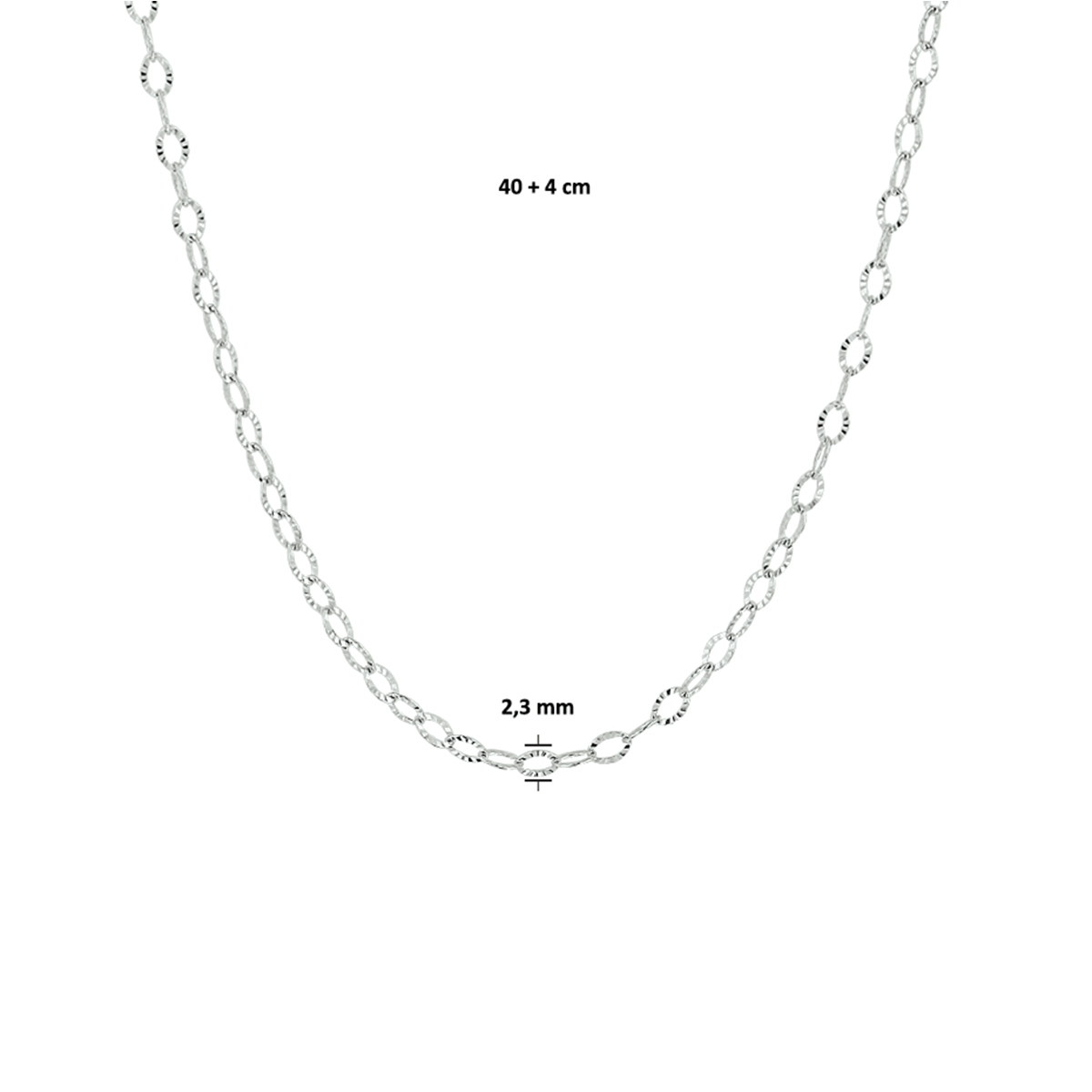 Gerhodineerd zilveren collier met een schakelbreedte van 2.3mm. Het collier heeft een draaglengte van 40cm en een extensie van 4cm. Info: Gerhodineerd zilver is door de rhodiumlaag beter bestand tegen verkleuren en krassen.