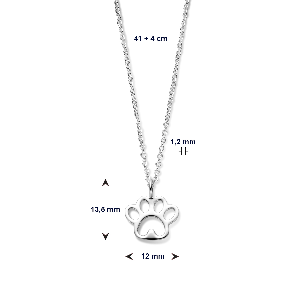 Gerhodineerd 925 zilveren collier uitgevoerd met hanger in de vorm van een hondenpoot. Het collier heeft een schakelbreedte van 1.2mm en is uitgevoerd met karabijnluiting. De draaglengte is 41cm met een extensie van 4cm.