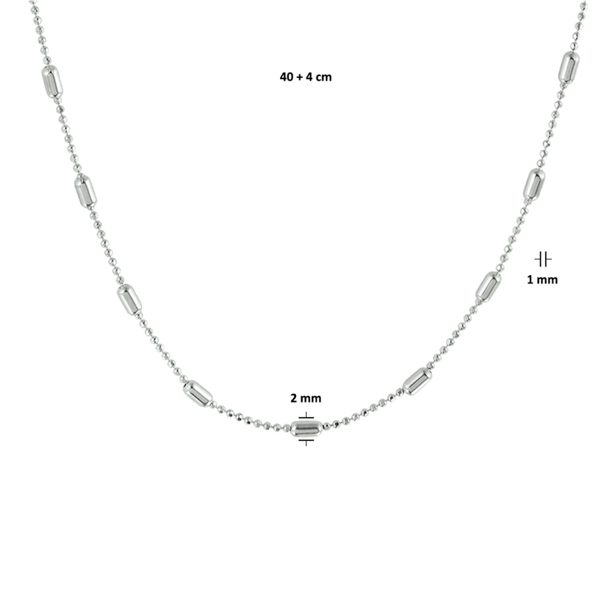 Trendy gerhodineerd zilveren collier uitgevoerd met staafjes van 2mm. Het collier heeft een stevige karabijn sluiting en een draaglengte van 40cm met een extensie van 4cm.