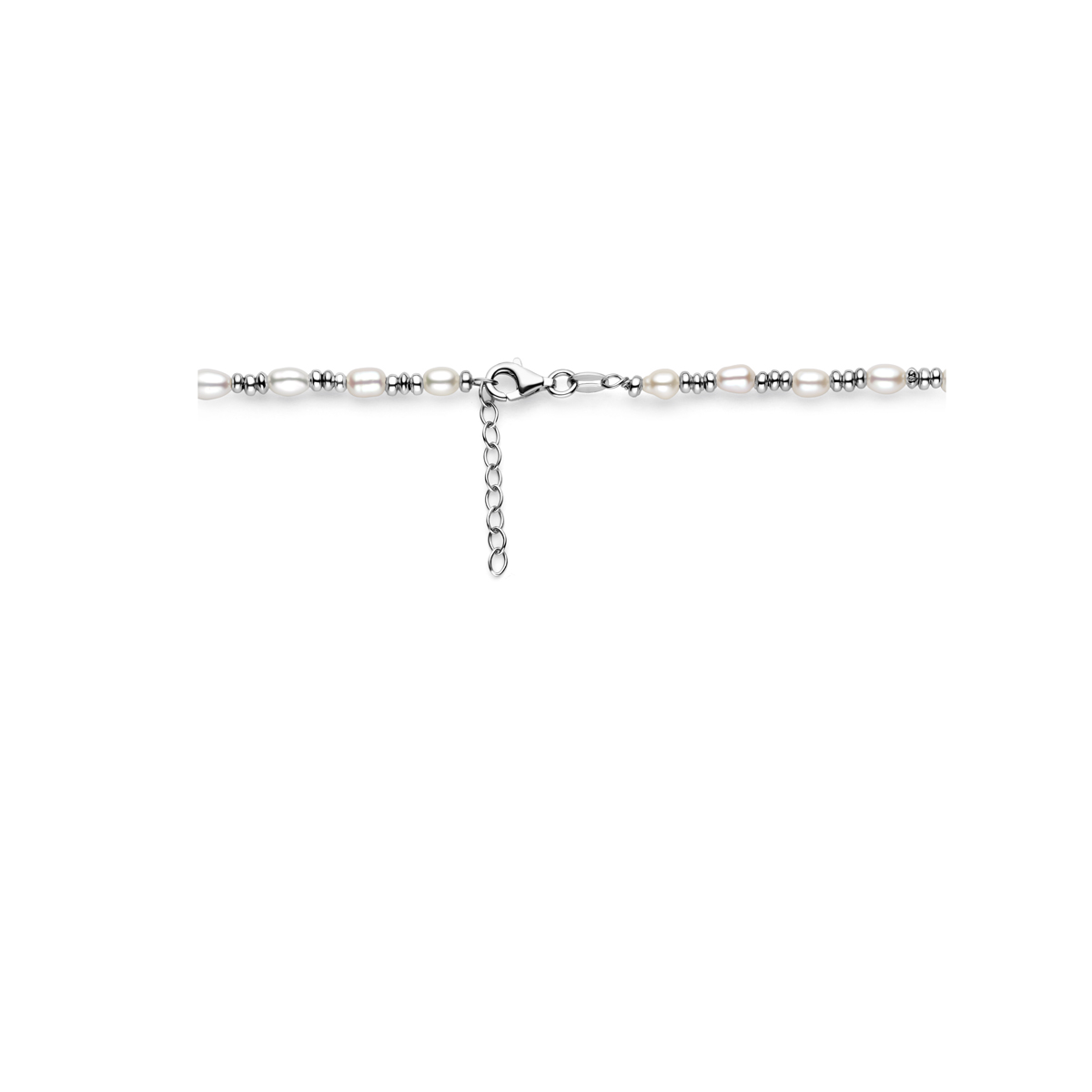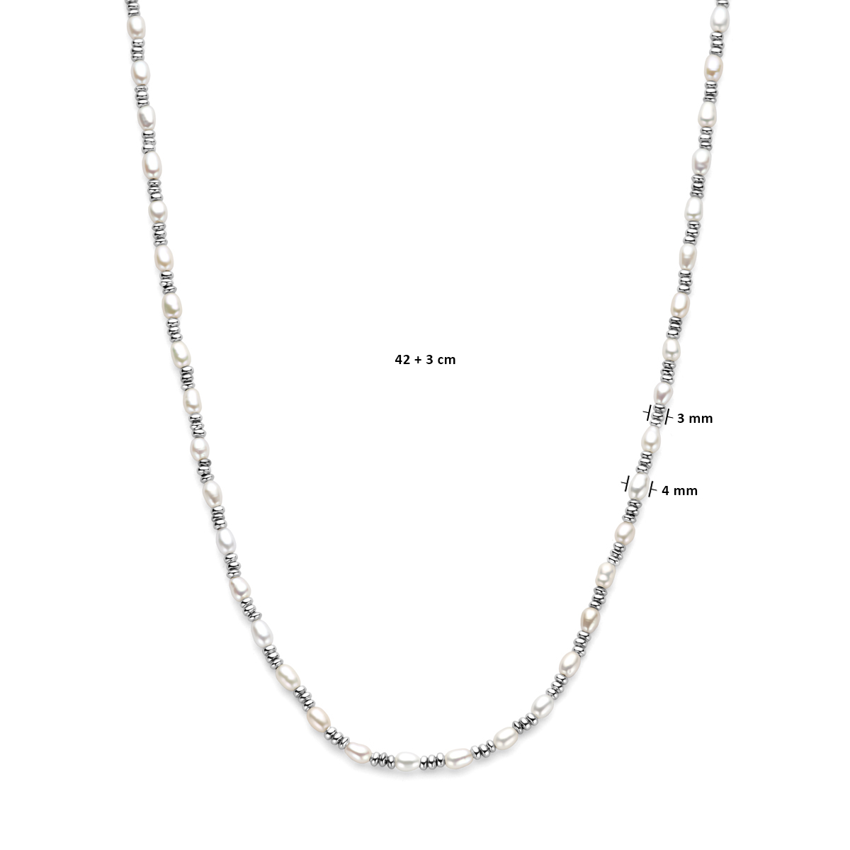 Gerhodineerd 925 zilveren collier uitgevoerd met zoetwaterparels en een karabijn sluiting. De schakelbreedte is 3mm.