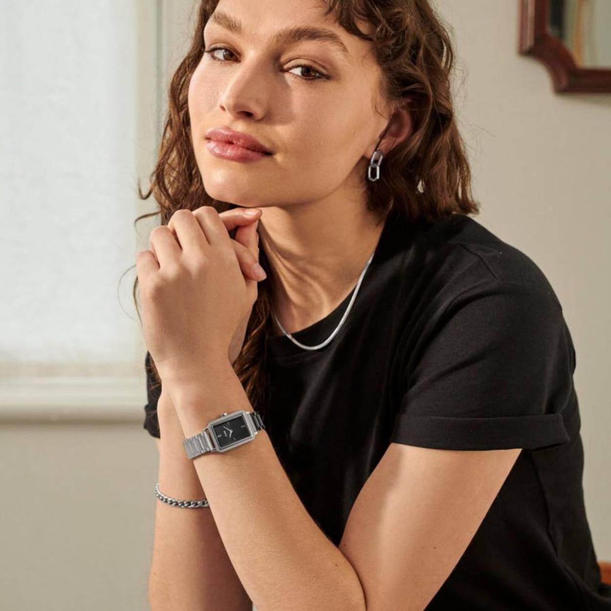 When elegant chic unites with timeless class. Braced with a polished 30.6 mm case and a classic stainless-steel link bracelet, our Fluette watch in black and silver colour seamlessly blends sophistication with an air of vintage. Featuring a matte black textured dial and our signature rectangular case shape, we’ve carefully designed this eye-catcher with a unique intention in mind - to instantly create a strong presence. You can easily adjust the strap size by yourself. Crown your wrist with this timeless piece, and carry a minimalistic, unique flair with every step you take.