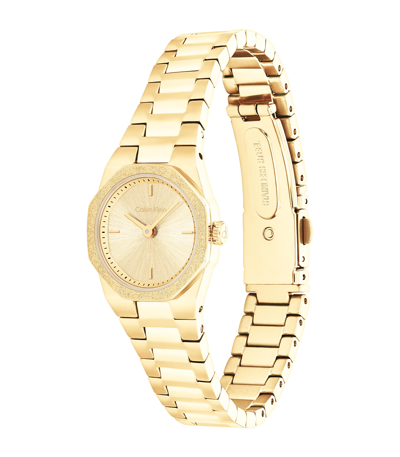 Deze stijlvolle horloge met modelnummer 25100142 van een niet-gespecificeerd merk heeft een goudkleurige wijzerplaat en schakelband. Gemaakt van roestvrij staal, nikkelvrij en voorzien van quartz uurwerk. Het horloge is analoog-digitaal en spatwaterdicht (niveau 3). Perfect voor stijlvolle gelegenheden of dagelijks gebruik. Draag het om je pols voor een elegante uitstraling.