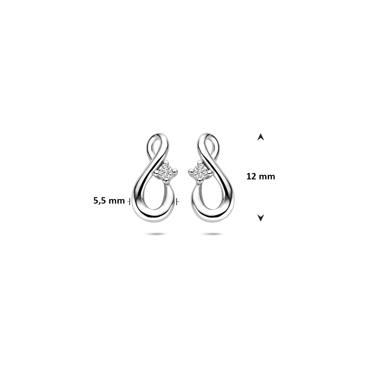 Gerhodineerd 925 zilveren oorknoppen uitgevoerd in de vorm van een infinity met zirkonia. De oorknoppen hebben een afmeting van 12x5.5mm.