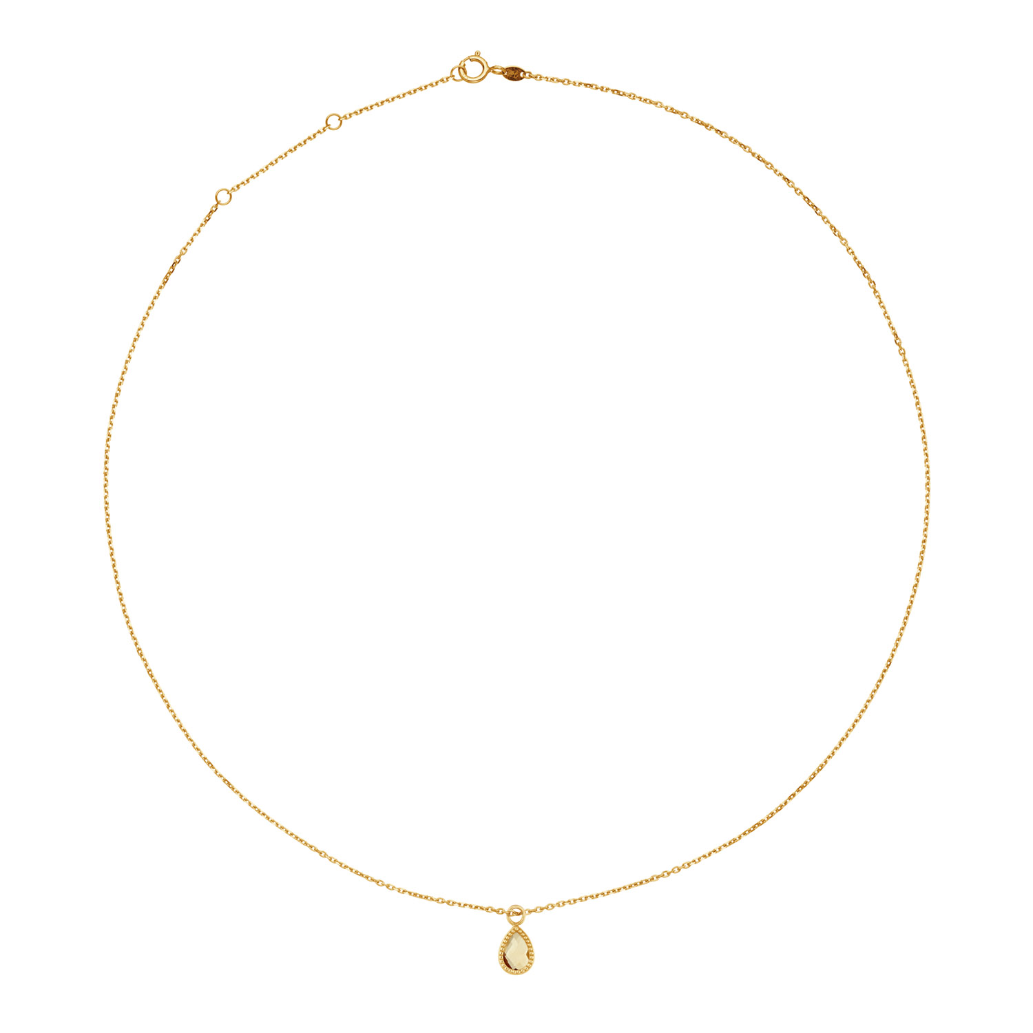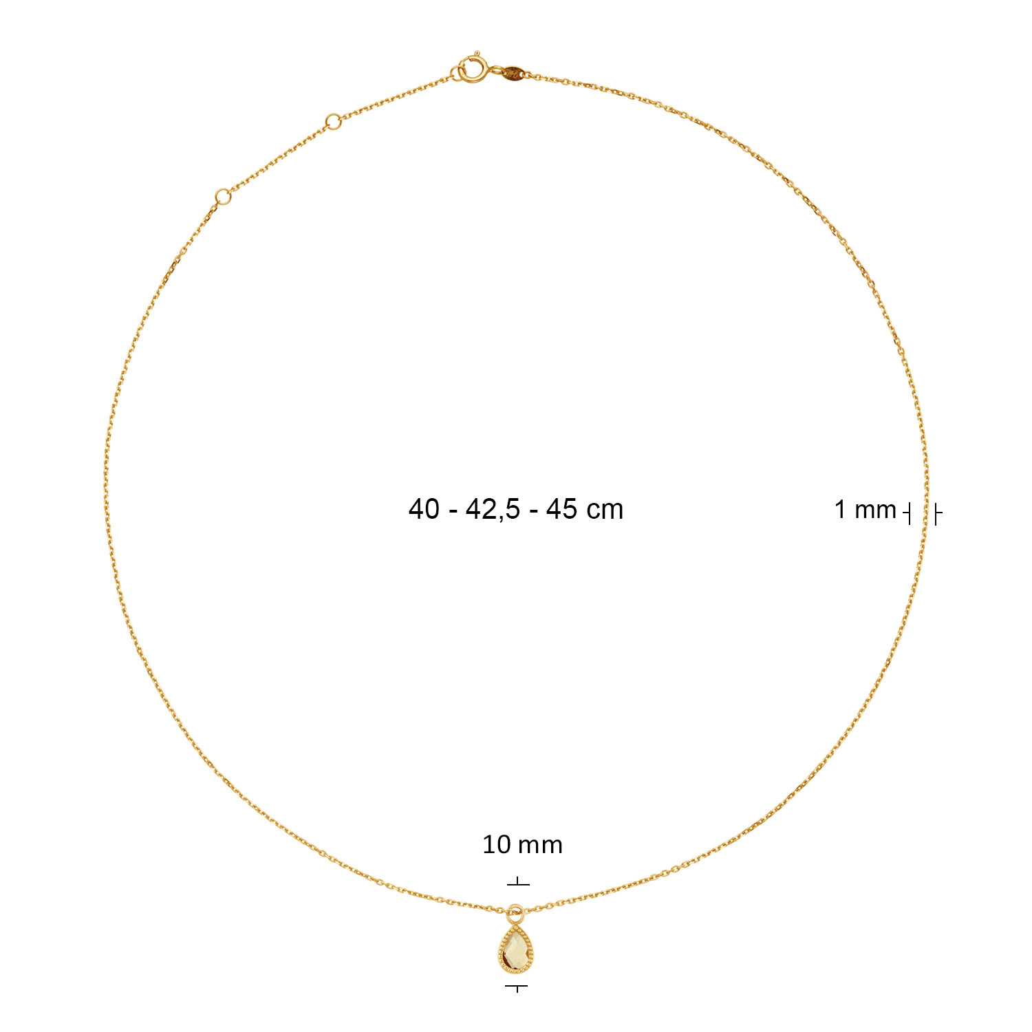 Dit is een collier van het merk Jackie. De ketting is gemaakt van 14 karaat goud. Aan de ketting hangt een bedel met daarin de edelsteen Citrien. De ketting is verstelbaar in de maten 40-42,5 en 45 cm.