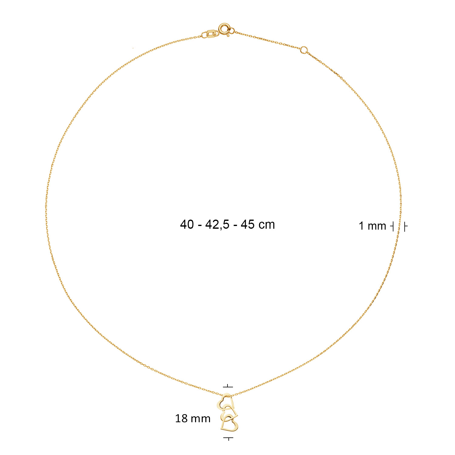 Dit is een collier van het merk Jackie. Het collier is gemaakt van 14 karaat goud. Er zit een hanger aan de ketting met daaraan 3 hartjes. De lengte is verstelbaar in de maten 45-47,5-50 cm.