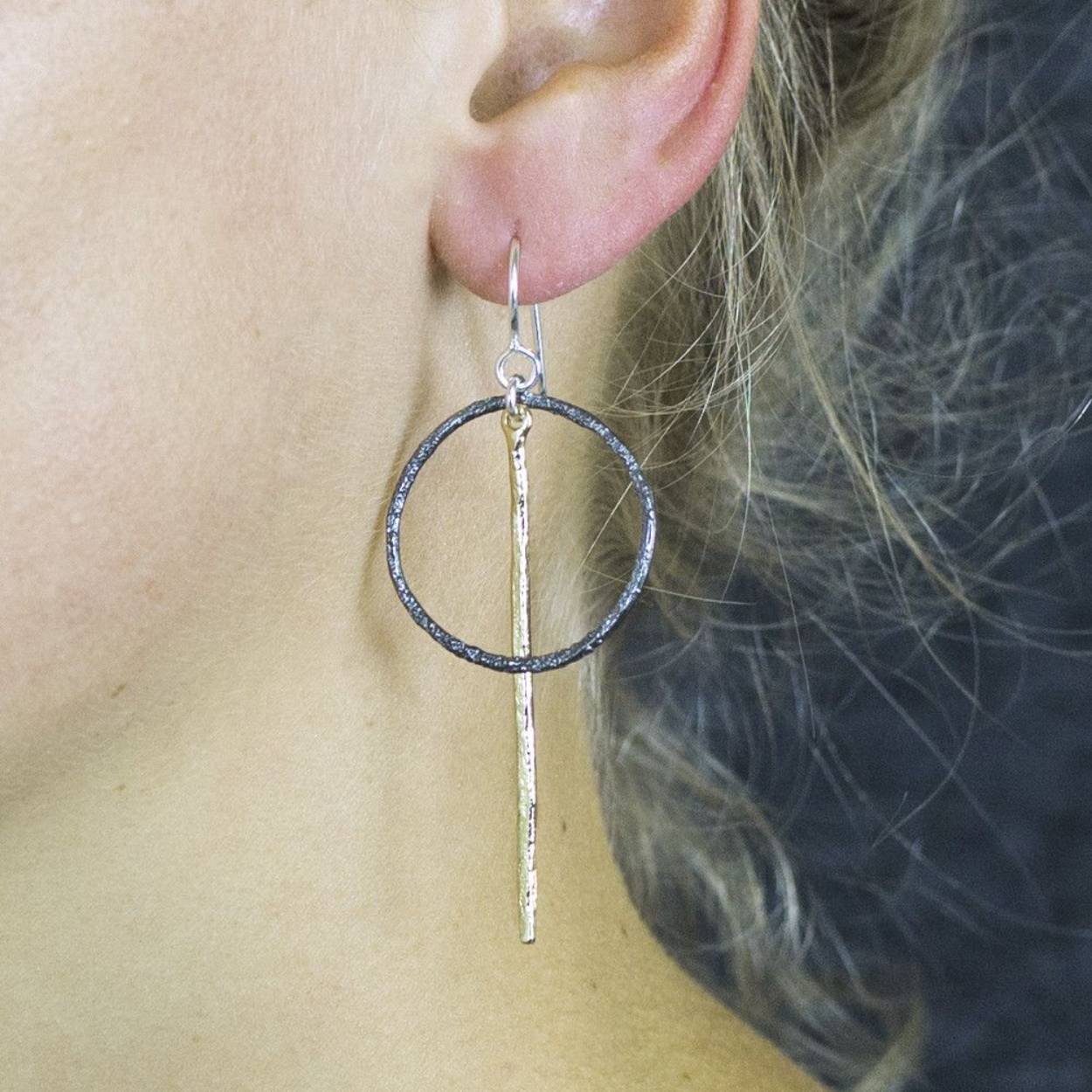 Oorhanger gemaakt van 925 sterling zilver, geoxideerd zilver en G14K zilver verguld. Aan de oorhanger hangt een geoixideerde cirkel, voor de cirkel hangt de vergulde pin. Materiaal: 14 karaat zilver verguld Vergulden is het bedekken van een voorwerp met een laagje goud. Dit artikel is door een goudbad gehaald wat ervoor zorgt dat het zilver volledig bedekt wordt met een laagje 14 karaats goud. Resultaat een mooie glanzende afwerking met een laagje echt goud wat ook wel silverplated of goldplated wordt genoemd.