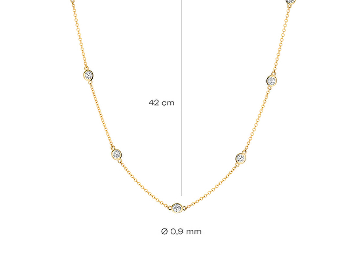 Glinsterende zirkonia in gladomzetting (3,4 mm) en 14k geelgoud maken van dit collier een geraffineerde eyecatcher. Mooi op zichzelf of mix en match met andere sieraden uit onze collectie, bijvoorbeeld met armband 2237YZI.
