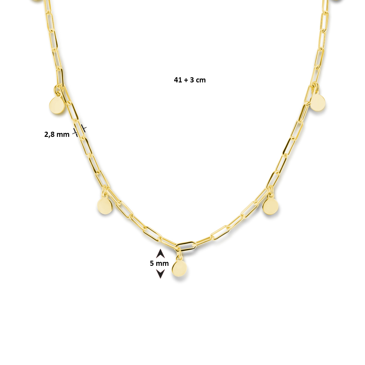 Geelgoud op 925 zilveren collier uitgevoerd met ronde hangers van 5mmen een karabijn sluiting. Het collier heeft een draaglengte van 41cm en een extensie van 3cm. Geen garantie op plating.