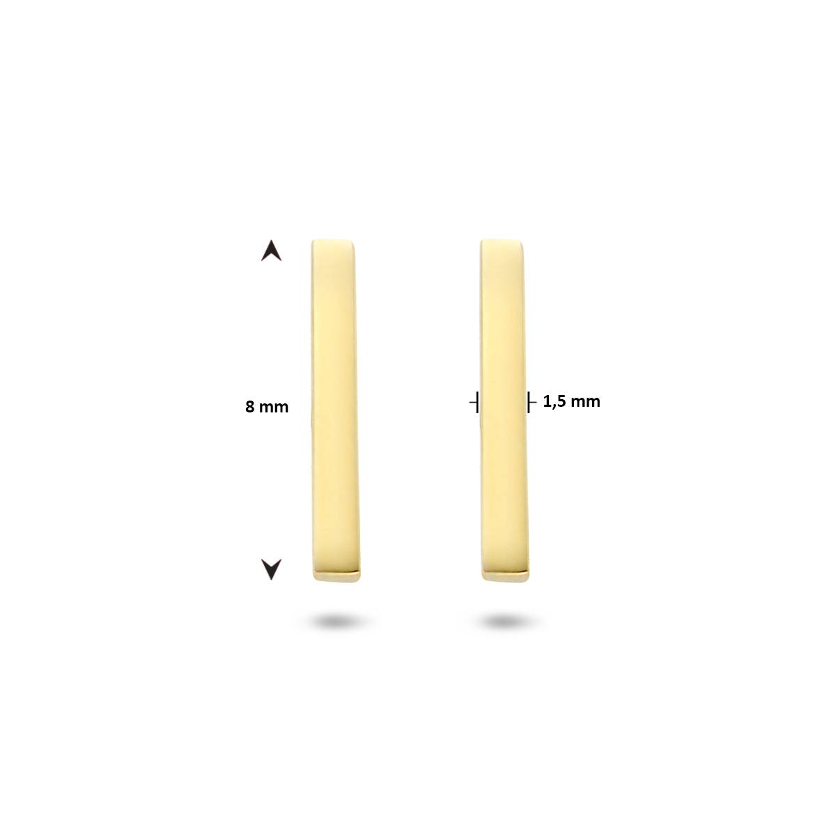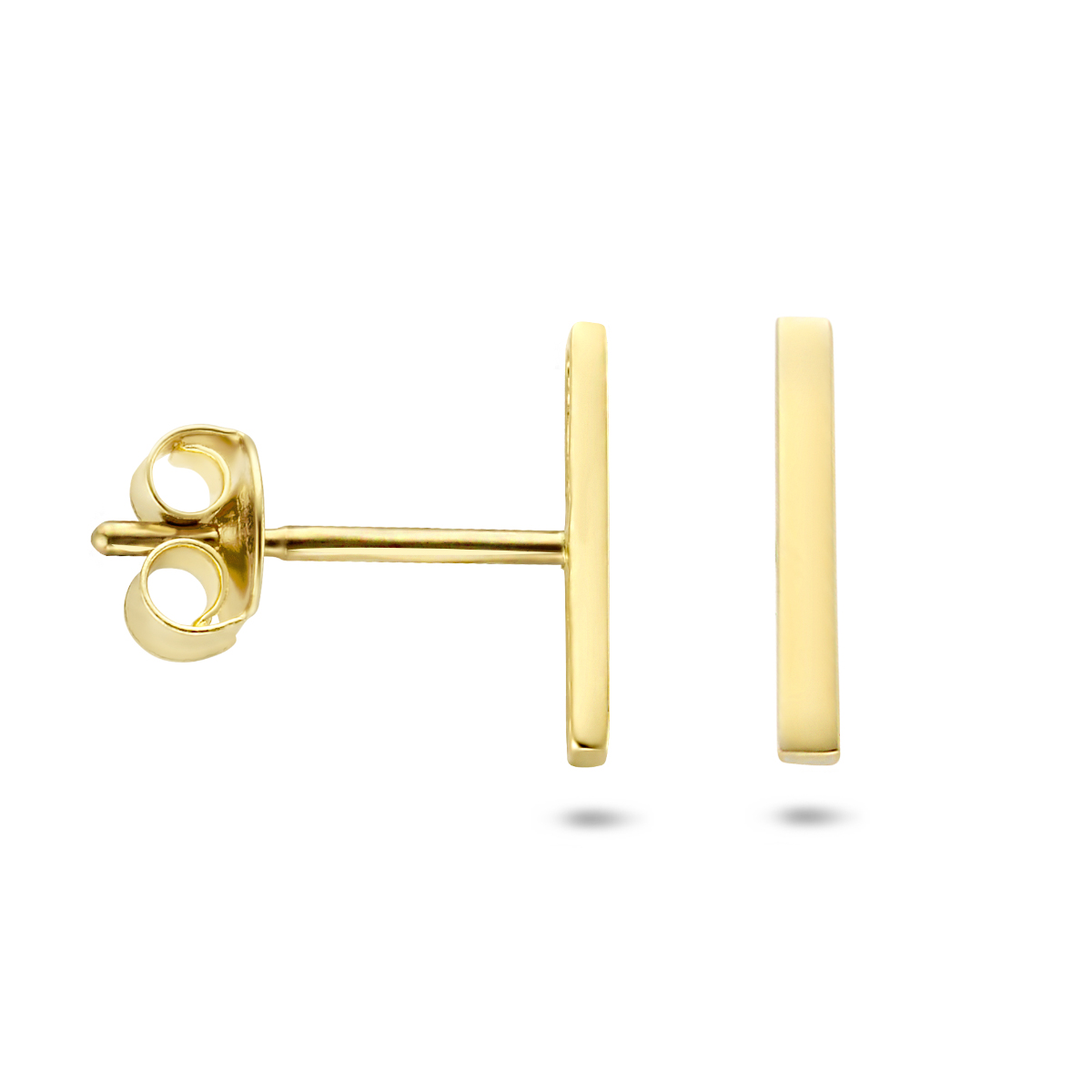 Trendy geelgouden oorknoppen in de vorm van een balkje. De oorknoppen hebben een afmeting van 8.5 x 1.5mm. Tip: Combineer de oorknoppen met bijpassende sieraden uit onze collectie en maak zo een trendy set!