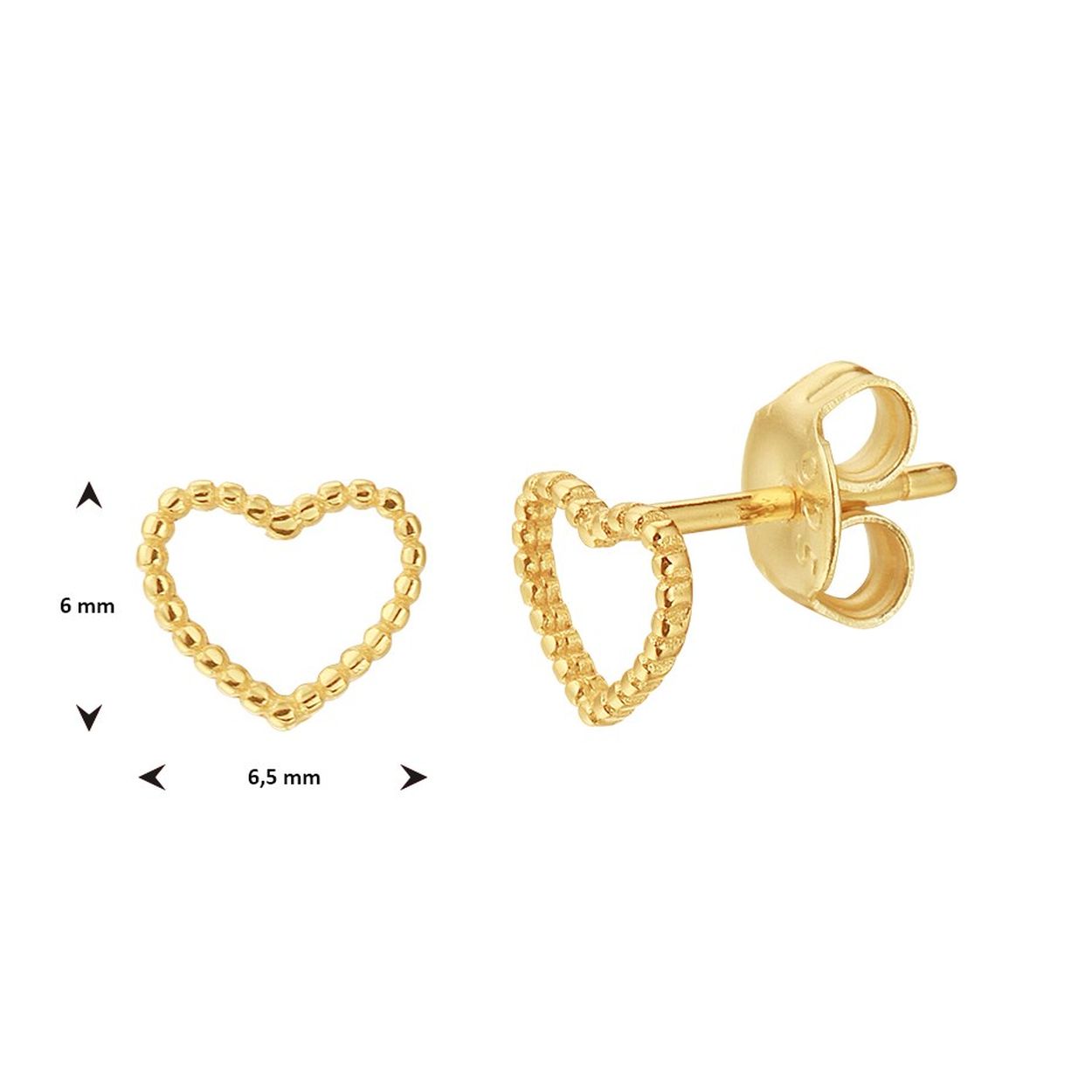 Geelgoud op 925 zilveren oorknoppen uitgevoerd in de vorm van een hartje. De oorknoppen hebben een afmeting van 6x6.5mm. Geen garantie op plating