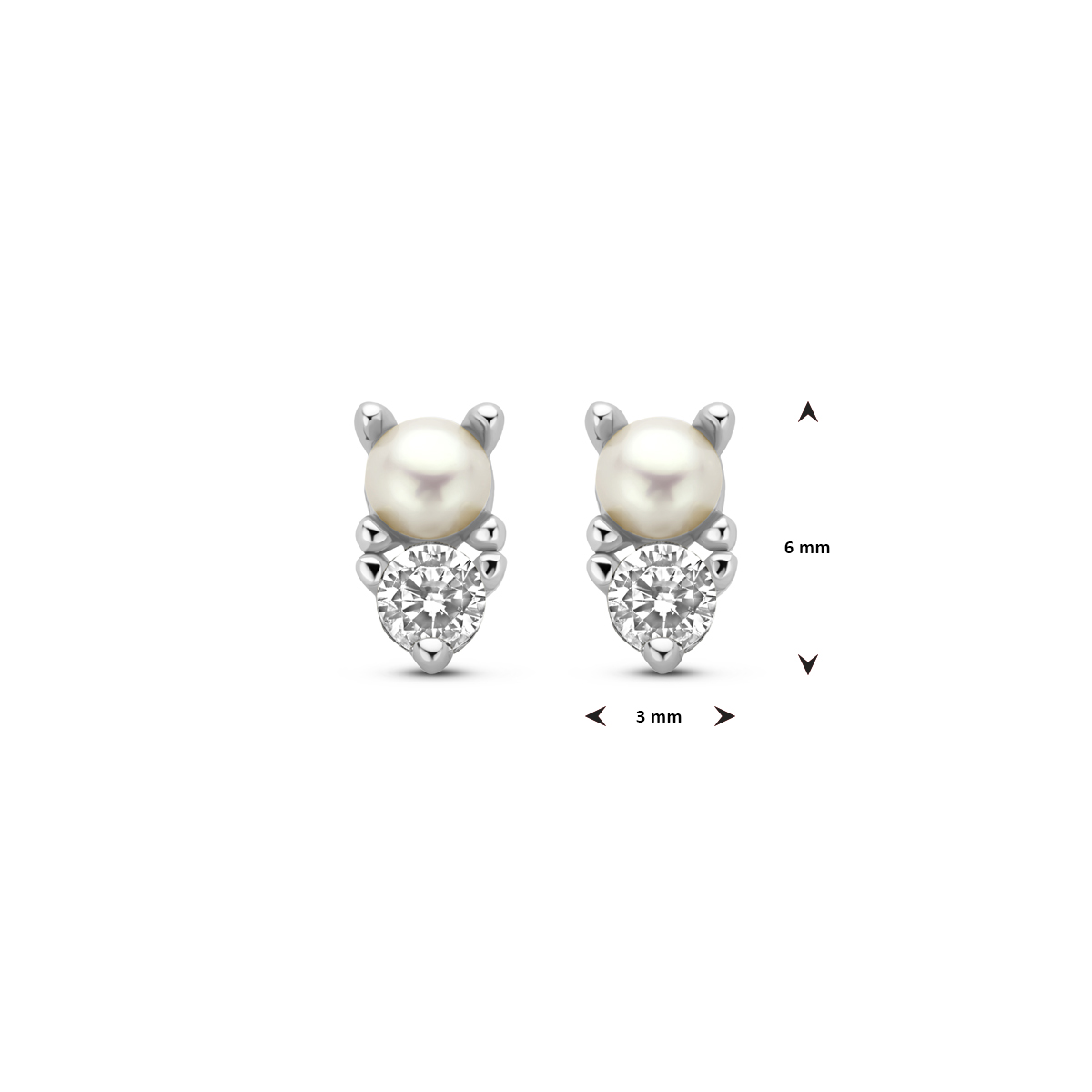 Gerhodineerd 925 zilveren oorknoppen uitgevoerd met zirkonia en zoetwaterparel. De oorknoppen hebben een afmeting van 6x3mm.