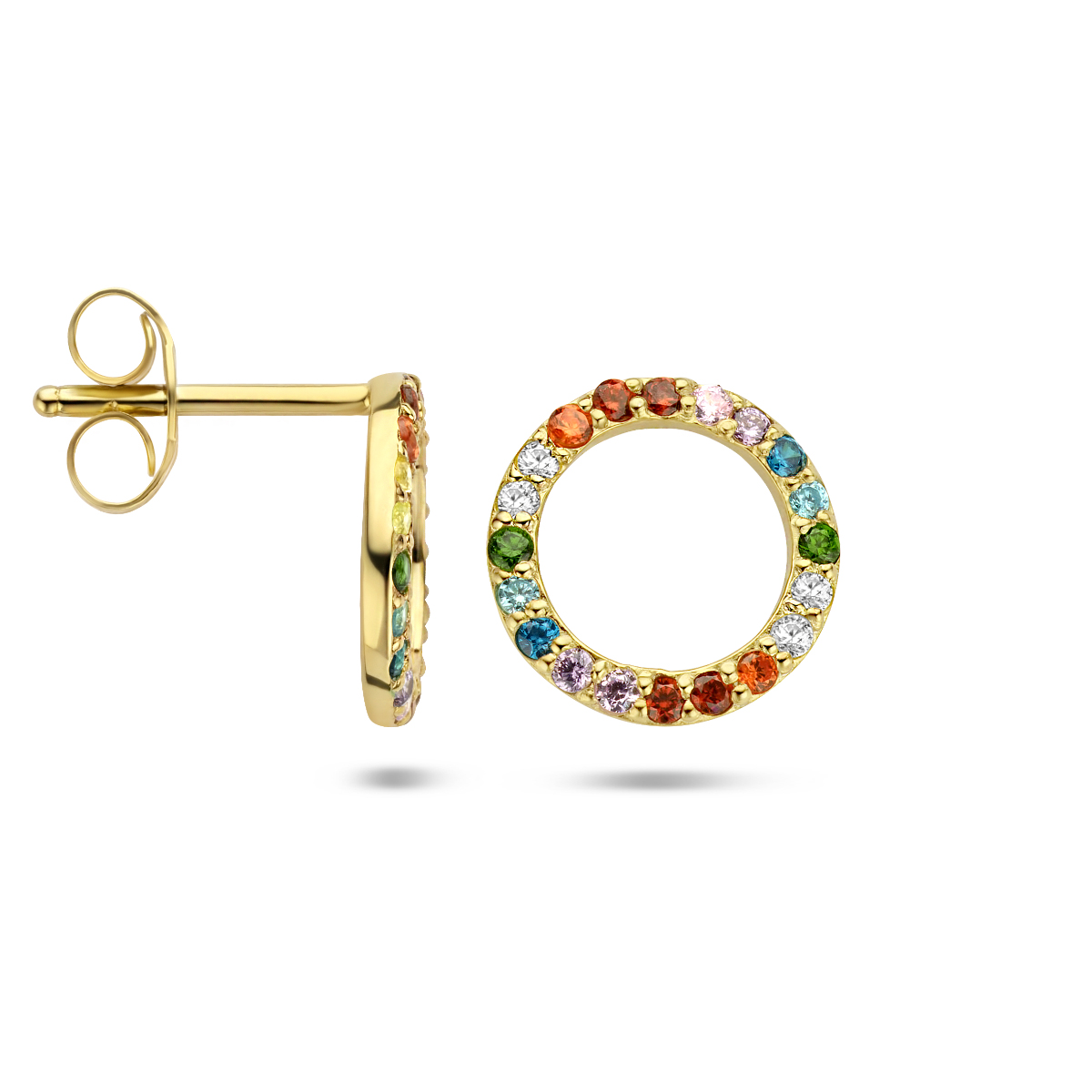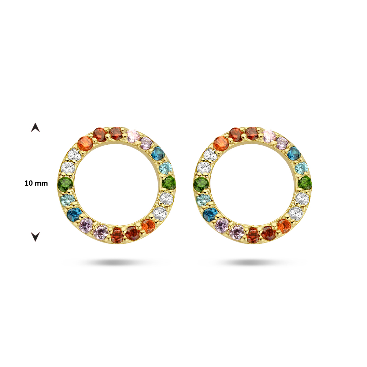 Geelgoud op 925 zilveren oorknoppen in de vorm van een rondje. Uitgevoerd met een gekleurde zirkonia rij. De oorknoppen hebben een diameter van 10mm. Geen garantie op de plating.