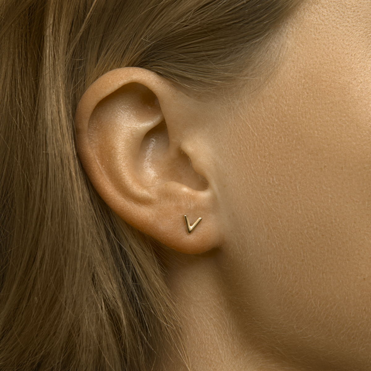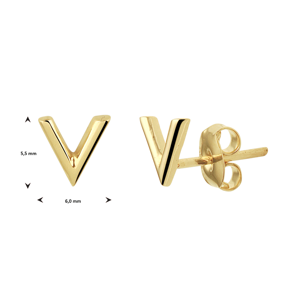 14k Geelgouden oorknoppen uitgevoerd in een V-vorm. De oorknoppen hebben een afmeting van 5.5x6mm.