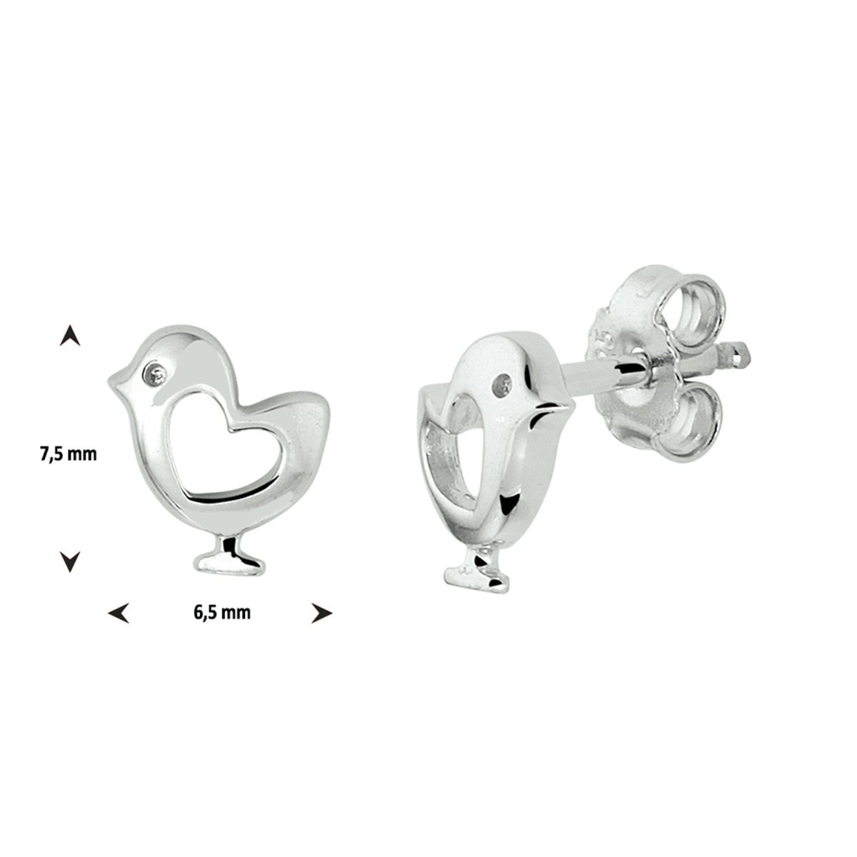 Beschrijving: Gerhodineerd zilveren oorknoppen in de vorm van een vogel met een hartje. De oorknoppen hebben een afmeting van 7.5x6.5mm. Info: Gerhodineerd zilver is door de rhodiumlaag beter bestand tegen verkleuren en krassen.
