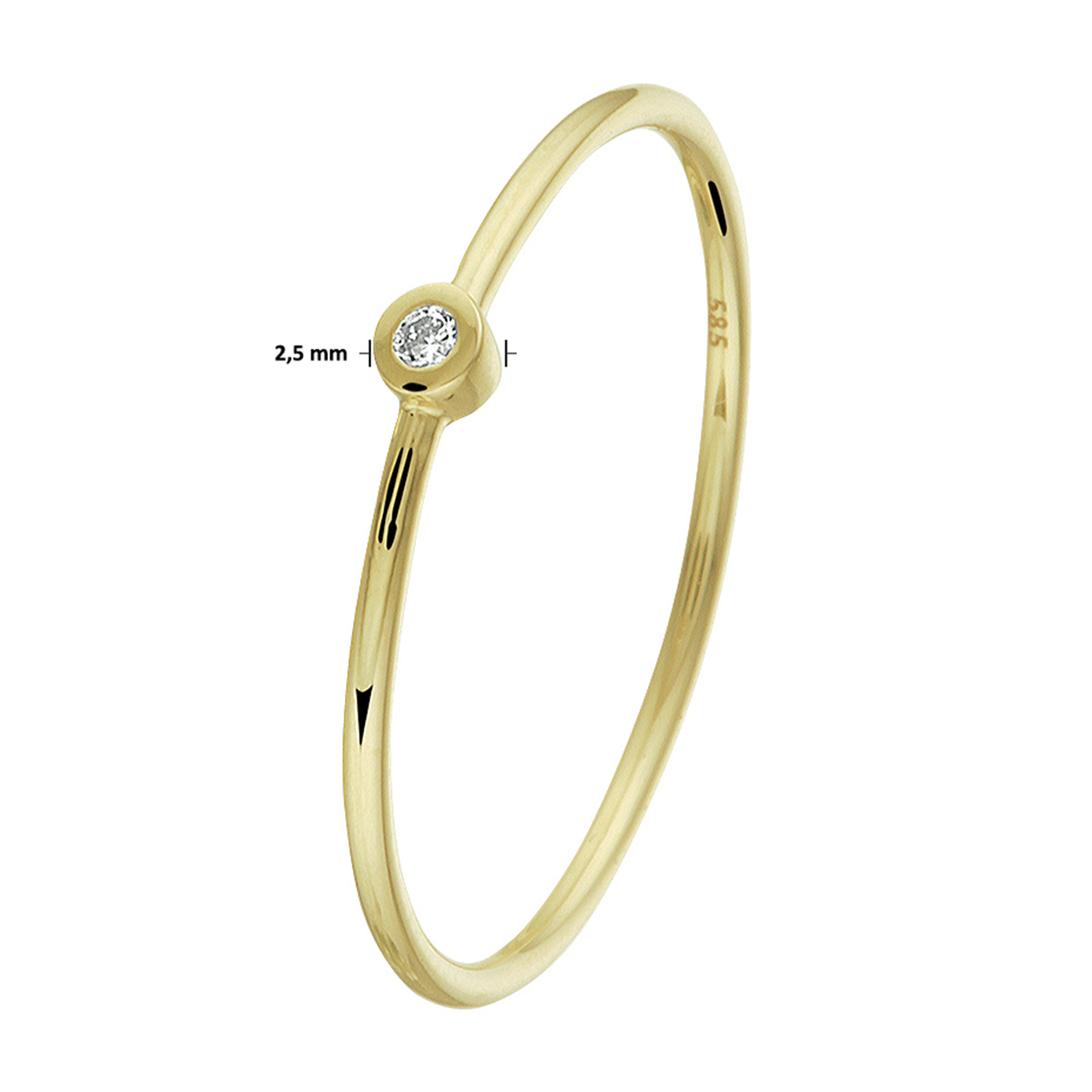 14k Geelgouden ring uitgevoerd met een schitterende diamant. De ring heeft een breedte van 2.5mm en een sterke scheen door getrokken draad.