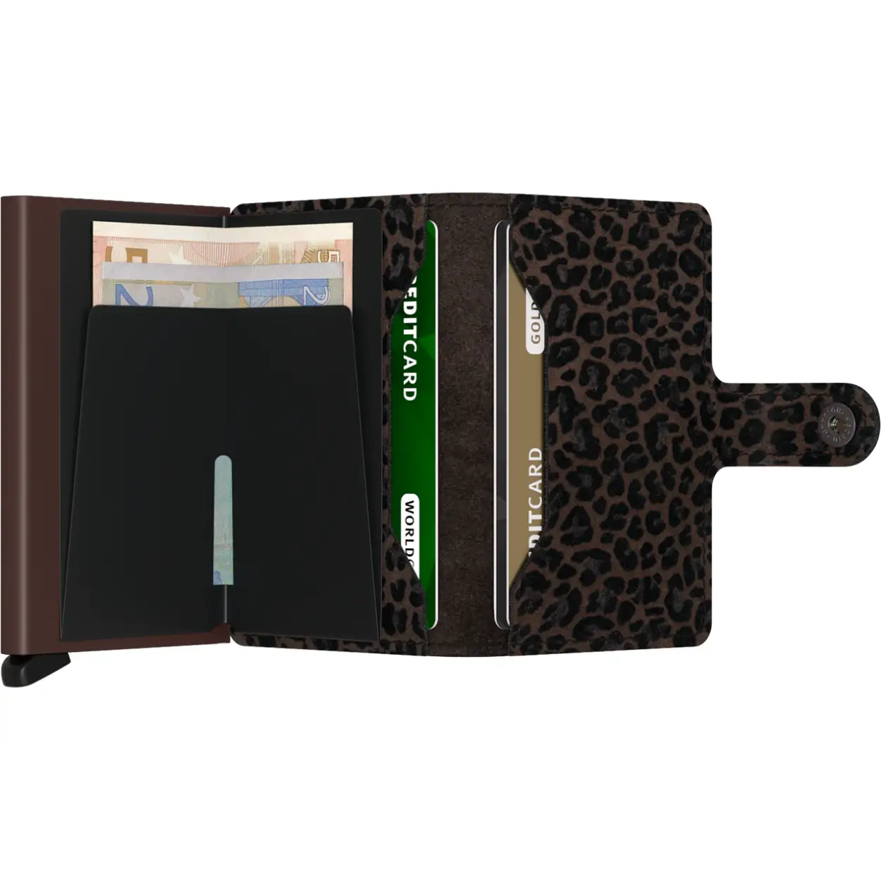 Klein van formaat en verrassend groot in opslagcapaciteit. De Miniwallet combineert het beste van twee werelden. De omhulsel bevat bankbiljetten, bonnetjes en kaarten, terwijl de aluminium Cardprotector het mogelijk maakt om kaarten met één simpele beweging uit te schuiven en ze te beschermen tegen buigen, breken en ongewenste draadloze communicatie (RFID-safe).
