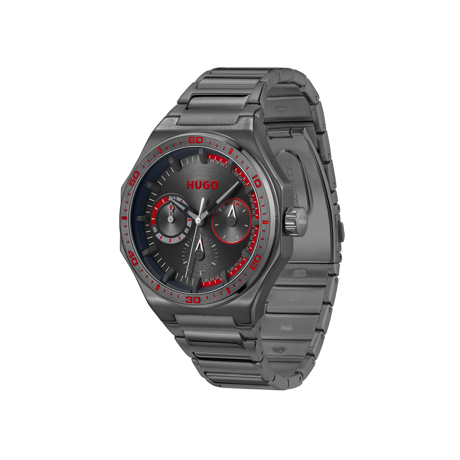 HUGO heren horloge uit de serie  GRAIL SPORT 44mm  (HU1530401 ) is ontworpen voor de man met durf en die volledig zichzelf is in zijn eigen unieke stijl. Het herenhorloge kenmerkt zich door zijn hoekige stalen gunmetal horlogekast met bedrukte bezel. Het ontwerp is opvallend vanwege zijn stoere 'kijk mij nou eens' uitstaling en de wijzers en de rode accenten op de zwarte geborstelde wijzerplaat. Het herenhorloge heeft een dag,- datum,- en 24-uursaanduiding. Aan de kast zit een stalen gunmetal strak ogende schakelband met een vouwsluiting. Het sportief stoer ogende herenhorloge heeft een mineraalglas, een doorsnee van 44mm en is 5ATM.