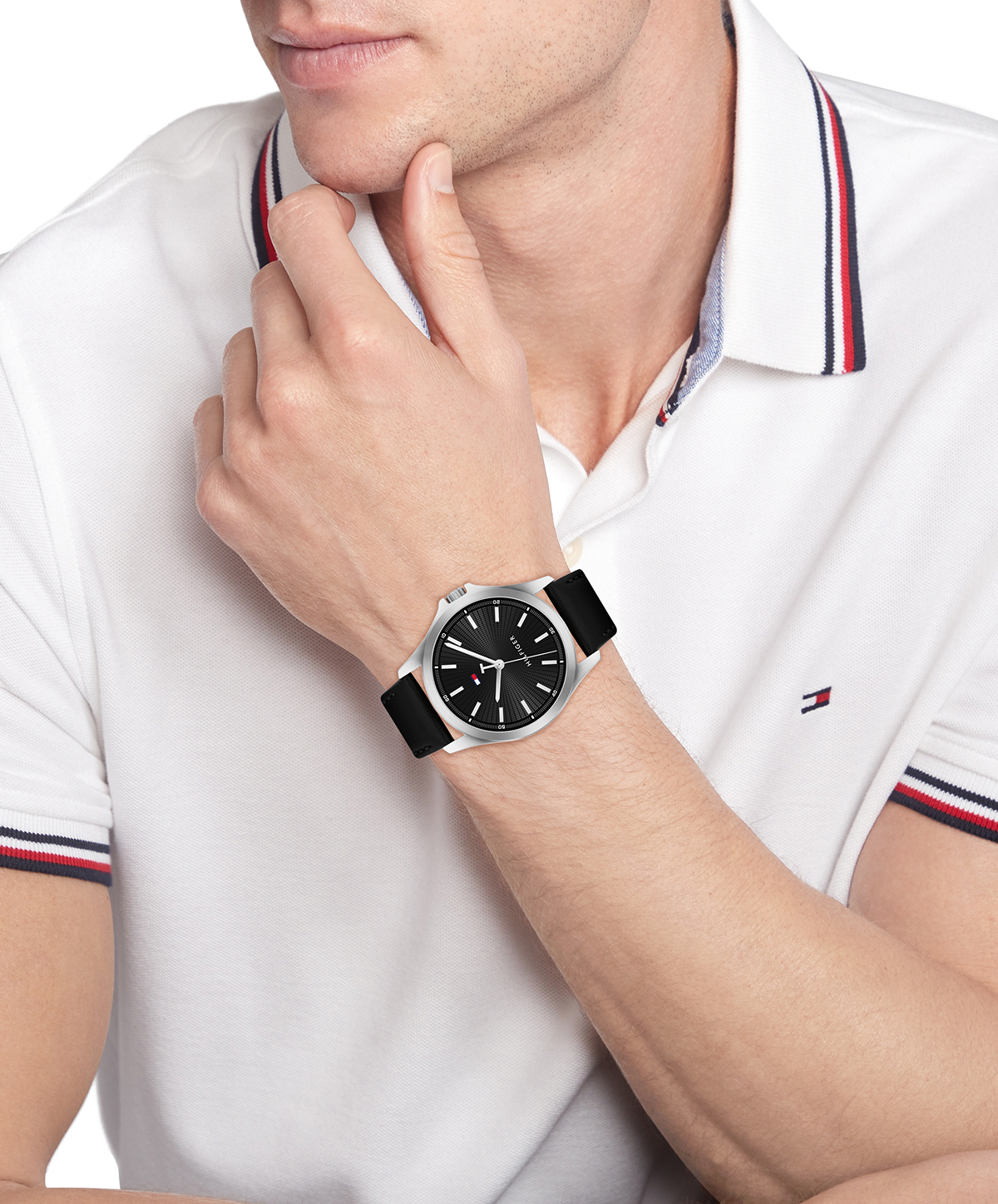 Tommy Hilfiger horloge met zwarte wijzerplaat en een zwarte leren band,  zwarte wijzerplaat serie Bruce. 3 ATM dichtheid.De tijdsaanduiding is analoog , er zit een quartz uurwerk in .