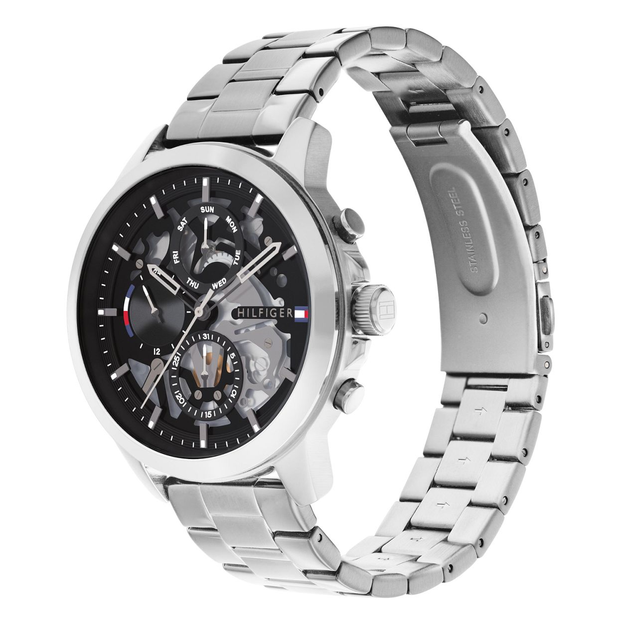 Dit unieke horloge van Tommy Hilfiger met artikelnr: TH1710477 is een casual horloge. Het stalen herenhorloge heeft een ronde zilverkleurige kast met een gladde bezel en een opengewerkte wijzerplaat ofwel skeleton genoemd. Op de zwarte wijzerplaat zijn de dag datum en 24- uurs aanduiding zichtbaar in ronde uitsparingen en zijn diverse schroefjes van het uurwerk zichtbaar. Het horloge heeft een zilverkleurige stalen schakelband een mineraalglas een doorsnee van 44mm en is 5 ATM.  Het horloge heeft een stoere uitstraling voor de echte Tommy klant.