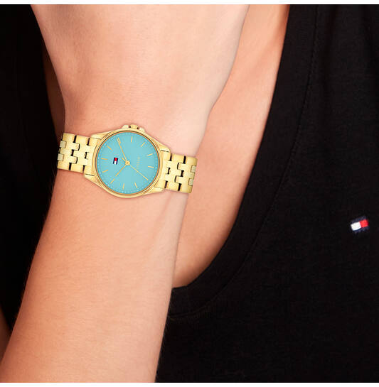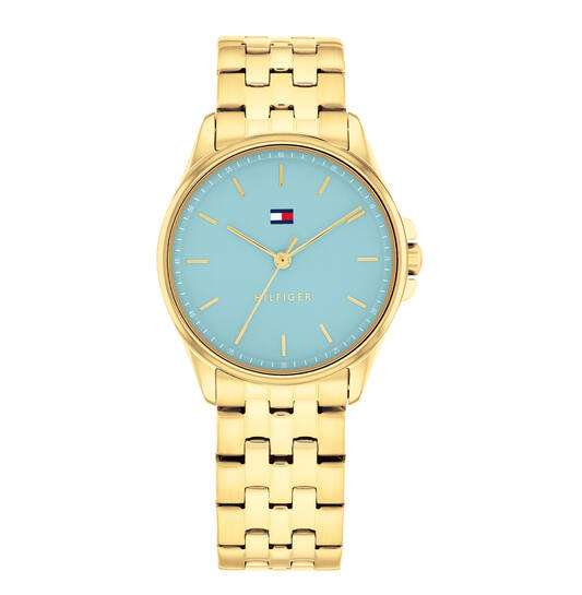 Tommy hilfiger horloge Jade met een lichtblauwe achterplaat. Het horloge heeft een doorsnee van 30 mm.